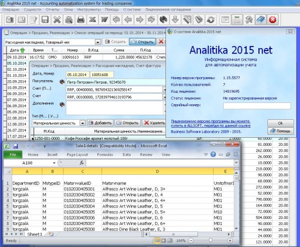 Импорт наименований товаров и услуг, цен продажи, первоначальных остатков, операций продаж, покупок, перемещений из Microsoft Excel файла. Получение отчетов как в собственной среде программы, так и непосредственно в MS Excel и MS Word. Консолидация данных филиалов компании в одну базу данных на уровне операций для получения целостной и обобщенной базы данных финансово-хозяйственной деательности компании.