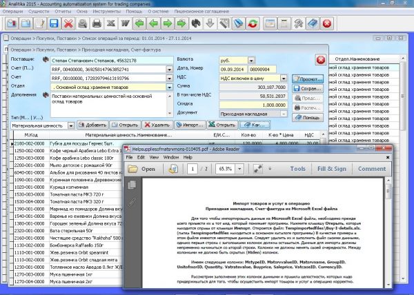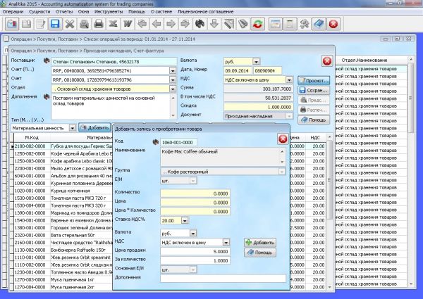 Реализован ввод всех основных операций, которые имеются в торговой деятельности. А именно, ввод первоначальных остатков товаров, материальных ценностей на складах, в магазинах и в торговых точках; покупка товаров от поставщиков; внутренние перемещения товаров, материальных ценностей из склада в магазин или в торговую точку и обратно; продажа, реализация товаров покупателям в выбранной пользователем единице измерения; списание товаров, материальных ценностей; предоплаты, выплаты поставщикам и от покупателей за предоставленные товары или услуги; выплаты сотрудникам и от сотрудников.
