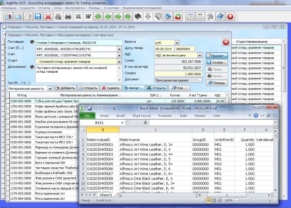 Добавлена возможность импорта данных из Microsoft Excel файла в базу данных. Теперь пользователю не придется вручную заполнять справочники: Материальные ценности, Услуги; Цены продажи; операции: Первоначальные остатки товаров в отделах компании; Покупки, поставки; Перемещения из склада в магазин или обратно; Продажи, если эта информация уже имеется в каком-либо электронном формате. Достаточно ее конвертировать в файл Microsoft Excel и одним нажатием клавиши импортировать в базу данных. Эта функция экономит массу времени как на начальном этапе работы с программой, когда нужно формировать справочники и вводить первоначальные остатки, так и облегчает текущую работу, если хотя бы какая то часть из выше перечисленной информации предоставляется пользователю в электронном формате. Так, например, эта функция будет удобна при изменении цен продажи на большое количество товаров. Ведь гораздо удобнее сформировать прайс-лист новых цен продажи на товары в MS Excel файле, а потом одним нажатием клавиши быстренько ввести новые цены в базу данных.