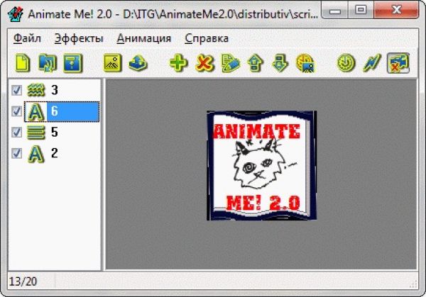 Используя Animate Me, можно создавать анимированные картинки в форматах AVI или GIF, для дальнейшего использования их на веб сайтах или в других местах. Можно использовать готовый список эффектов: бегущий текст, движущиеся объекты, частицы, волна, изменяющийся текст, появление, волна и другие.