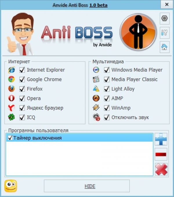 Работа надоела, устали вкалывать и хочется поиграть в любимые игрушки или посидеть в интернете на работе, а назойливый шеф так и стремится подойти к Вам и обломать весь кайф. И на этот случай мы придумали программу Анти босс. Теперь Вам не придется закрывать множество открытых окон и программ при каждом приходе начальника, ведь одним нажатием выбранной клавиатурной комбинации, все нужные Вам, и ненужные для шефа программы и игры исчезнут,а когда шеф уйдет снова появятся на экране. Все просто как некогда. Вам остается только указать какие игры или программы прятать и остальное программа сделает все за Вас, а Вы спокойно сможете играть на работе и не бояться заполиться перед шефом. Ну как и все наши программы, программа Анти босс бесплатная, не требует регистрации.