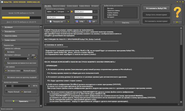 - Шифрование лог - файлов. Декодирование и просмотр только со съемного носителя (флешки). Полная версия программы регистрируется на уникальный идентификатор съемного носителя