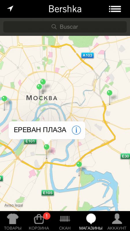 Естественно, как и все аналогичные приложения, Bershka позволяет определить ближайший магазин одежды и может показать его на карте.