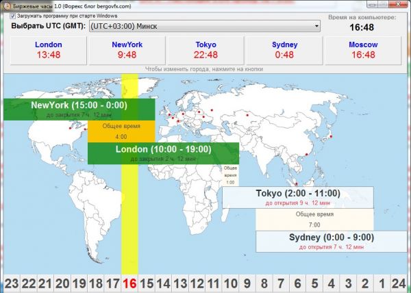 Биржевые часы - бесплатная программа, заинтересующая всех трейдеров. Дело в том, что она показывает информацию о текущем времени во всех финансовых столицах мира. Помимо прочего, вы можете добавить свои города и даты для отображения. Если утилита будет закрыта, все выставленные настройки сохранятся.