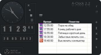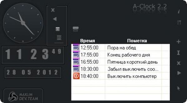 Будильник - Данная программа имеет много полезных функций, которые пригодятся вам. Например: Вы можете добавить запись с оповещением, о каком либо важном деле, и программа в установленное время сообщит вам о запланированном деле. Так же она может просто разбудить вас, если вы спите, постепенно повышаемая громкость звука поможет вам проснуться спокойно, а не напугает резким громким звуком. Еще программа может выключить, перезагрузить или выйти из системы. Например, это пригодится, если вы по каким либо причинам забыли выключить компьютер на работе, просто установить будильник с выключением компьютера на определенное время и программа выключит компьютер за вас.
