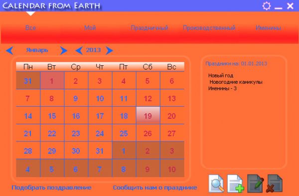 Календарь постоянно пополняется различными праздниками и событиями. Также из программы вы можите перейти на безопастные сайты с поздравлениями и легко подобрать нужное поздравление. Удобный дизайн позволит Вам быстро разобраться в программе.