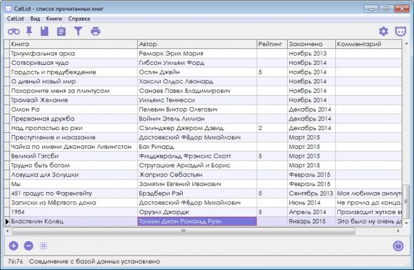CatList - удобное и многофункциональное приложение, которое будет интересно всем пользователям, читающим книги. С помощью данного приложения, вы можете пометить книги, которые уже прочитали, и выставить им рейтинг. Также можно остановить заметки, комментарии и воспользоваться фильтром для поиска. Интерфейс программы прост и открывает нам возможность создания удобной библиотеки, которая храниться в одном месте.