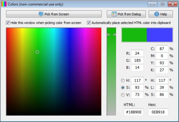 2. После того как вы выбрали нужный цвет, программа отображает значения цвета в четырех цветовых моделей: RGB, CMYK, HSV, HLS