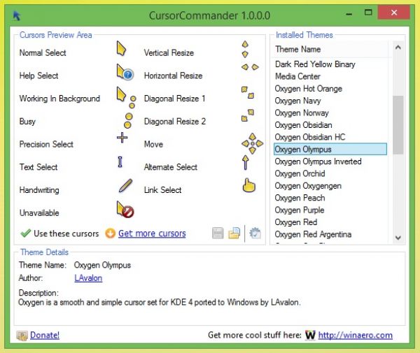 Cursor Commander - простое приложение, с помощью которого в один клик мыши можно изменить вид курсора. Вы можете поменять цвет и воспользоваться большой коллекцией картинок, подобрав понравившийся дизайн.