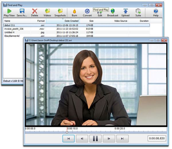 Основное предназначение утилиты Debut - video recorder - запись изображений с веб камер. Благодаря простой настройке, вы разберетесь в утилите, и будете получать все записи, непосредственно на PC. Все записи сохраняются в форматах: wmv, avi и других, не менее известных.