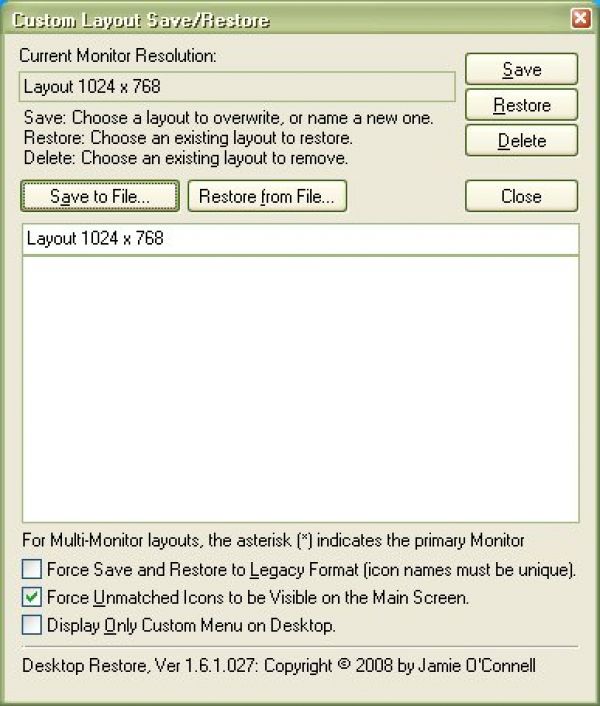 Desktop Restore - небольшое и удобное приложение, которое обязательно пригодится пользователям, предпочитающим порядок на своем рабочем столе. Если вы привыкли к определенному расположению иконок на экране, тогда воспользовавшись данной программой, вы сможете сохранить их.