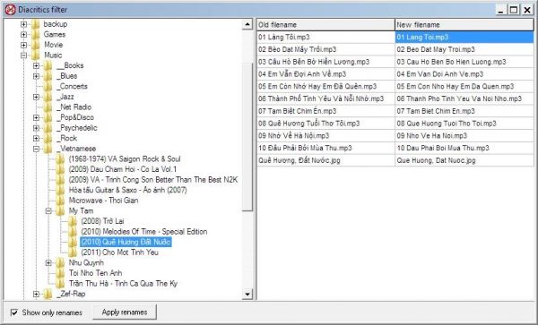 DiaFilter - простая утилита, которая поможет вам переименовать файлы, папки, путем удаление из слов диактрических символов. Часто случается так, что система не поддерживает национальные символы и вместо них пишет некорректные буквы.