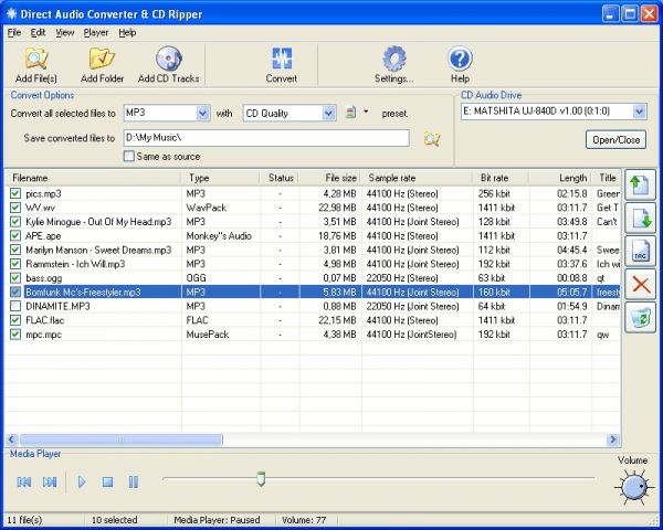 Для настоящих меломанов очень важно качество звучания трека или бывают ситуации, когда плеер или другое переносное устройство поддерживает только определенный формат музыкальных файлов. В данном случае вам пригодится приложение Direct Audio Converter and CD Ripper. Оно может конвертировать файлы в различные форматы и создавать огромную коллекцию.