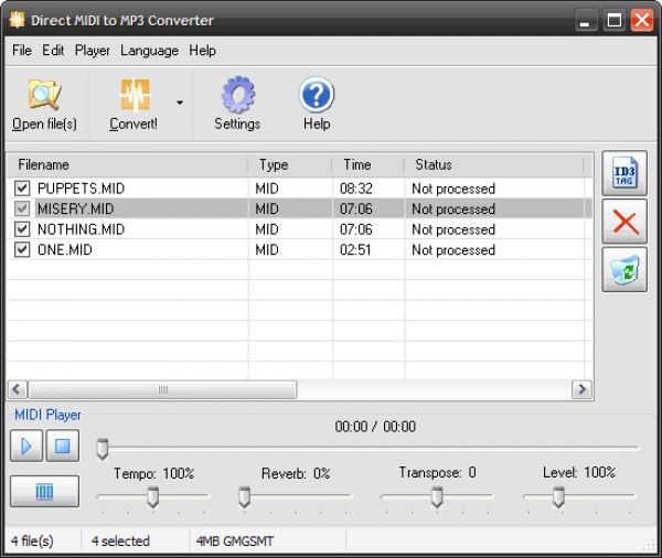 Если вы сочиняете музыку в формате Midi, рано или поздно, вы захотите прослушать её в MP3 плеере. В связи с этим вам понадобится конвертер Direct MIDI to MP3 Converter. Данная утилита работает со всеми типами миди файлов: RIFF MIDI 1, MIDI 0, MIDI 1, RIFF MIDI 0 и другими.