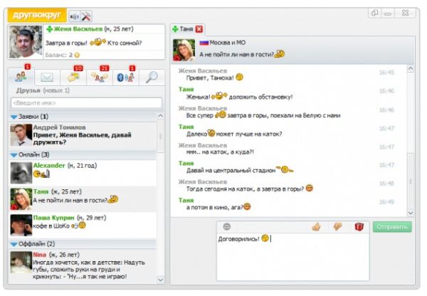 Приложение ДругВокруг предназначена для общения. Данную утилиту можно установить как на компьютер, так и на телефон. Теперь вы можете в любое время добавить новых друзей и поговорить с ними.