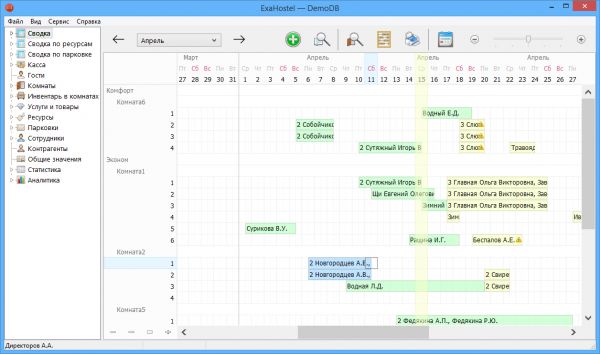 ExaHostel — программа для автоматизации работы хостела. Объединяет работу администратора, бухгалтера, руководителя, горничных и т.д. База данных содержит информацию о комнатах (дормах) и услугах, гостях и заказах, и не только это в режиме реального времени, онлайн.