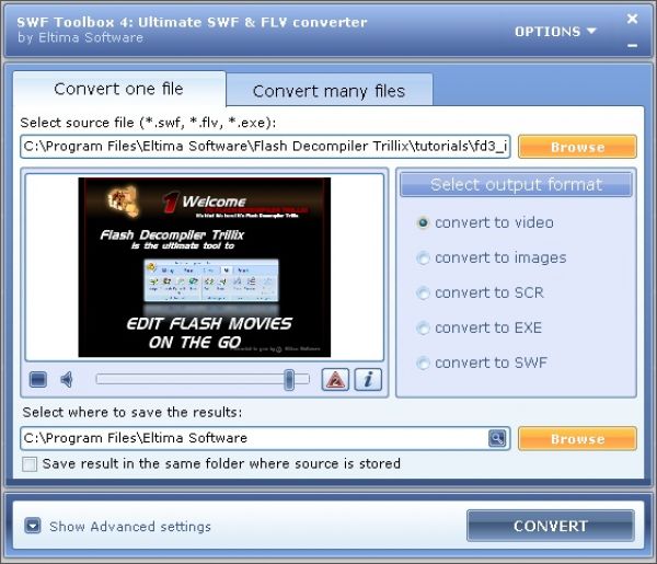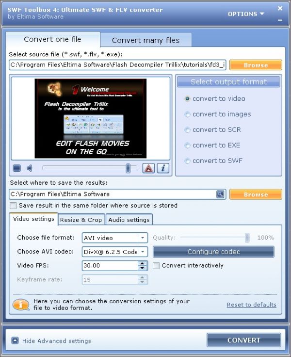 Как и говорит название утилиты FLV to AVI Converter, вы можете переконвертировать любой Flash ролик в AVI формат. Однако, это только основное направление, ролики также можно конвертировать в BMP, GIF, SCR, JPG, Progector EXE и другие. Преобразовывайте файлы в любой момент и смотрите ролики в любом проигрывателе. Помимо этого, все файлы можно кастомизировать и предварительно настроить.