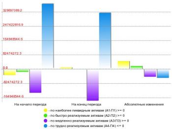 - ликвидности баланса (наиболее ликвидных активов, быстро реализуемых активов, медленно реализуемых активов, трудно реализуемых активов, а также платежного избытка или недостатка по ним, коэффициенты - абсолютной ликвидности, покрытия (текущей ликвидности);