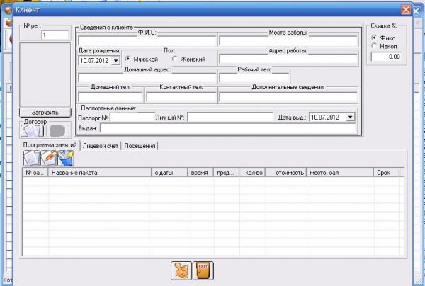 Автоматизированная система учета FitnesClub - предназначена для учета клиентов, визитов клиентов, контроля за своевременностью оплаты за услуги в фитнес клубах, тренажерных залах, бассейнах и д.р. учреждениях предоставляющие услуги как с использованием абонементов и разовой оплаты услуги.