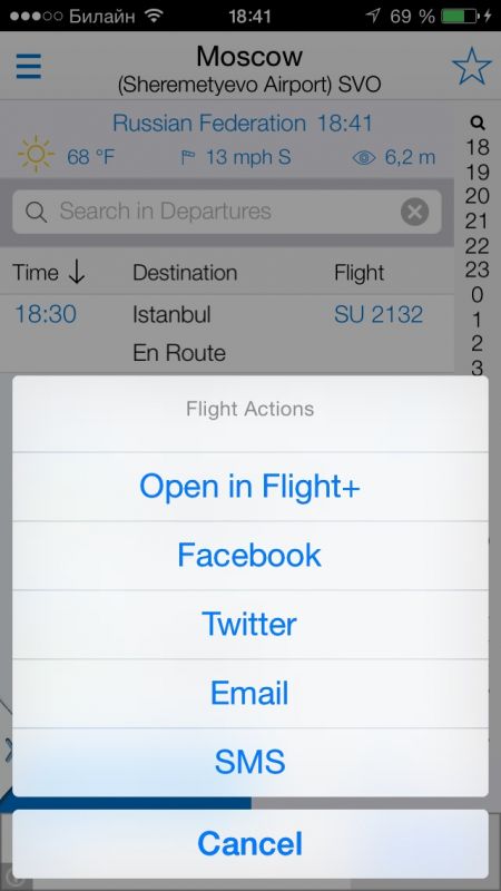 Flight Board - мобильное электронное табло всех аэропортов в вашем айфоне. Приложение содержит список пребывающих в реальном времени самолетов, а также список улетающих самолетов. В приложении есть в том числе и московские аэропорты - Шереметьево, Домодедово и даже такой аэропорт как Внуково. Вся информация обновляется в реальном времени.