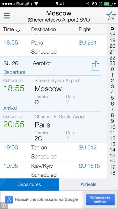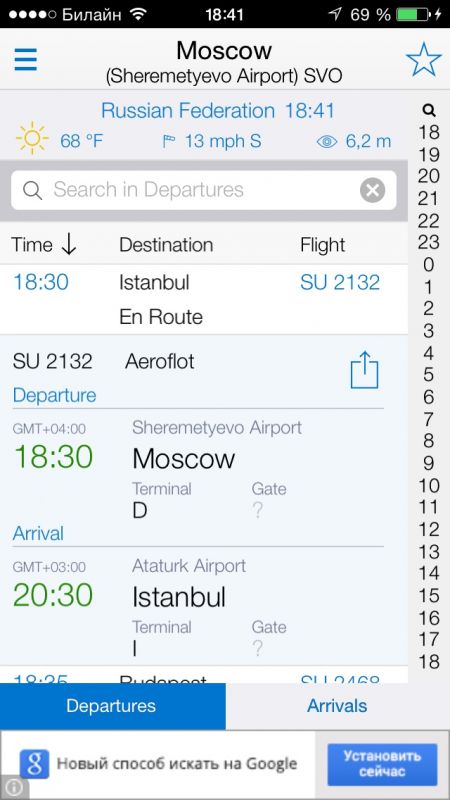 - Быстрое переключение между вылетающими и прилетающими рейсами.