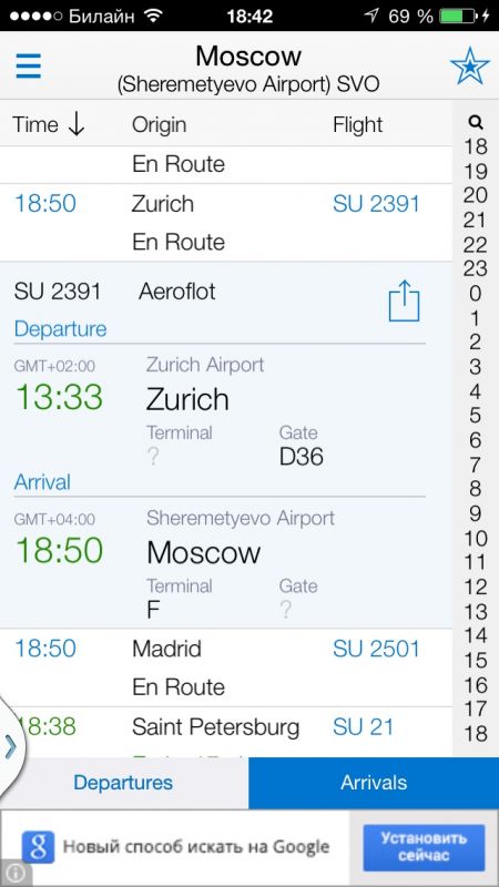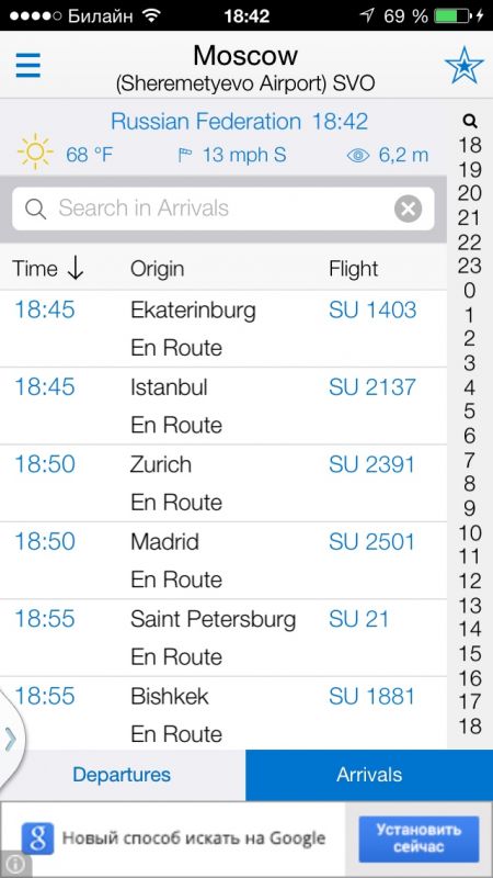 - Обновление каждую минунту, поэтому в приложении всегда самые актуальные рейсы.