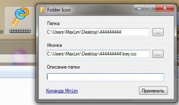 Пока еще совсем маленькая программа для смены иконки на папках, в программе нужно выбрать папку, иконку для папки и можно написать описание, ну и конечно же нажать кнопку Применить. Программа как видите версии можно сказать нулевой, но мы со временем обновим ее и сделаем более функциональной и удобной.