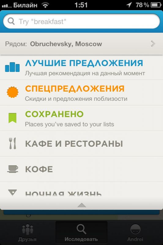 Foursquare – это социальная сеть, позволяющая обмениваться еще с 25 млн. ее пользователями информацией о местах для прогулок. Вы сможете искать места в соответствии со своими интересами, а так же кооперироваться со своими друзьями.