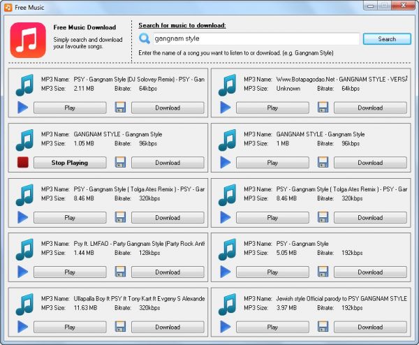 Free Music App - мощное приложение, способное заинтересовать практически каждого меломана. Используя данную утилиту, вы можете быстро найти необходимый трек для скачивания. Вам достаточно установить программу и ввести название композиции в соответствующее поле, после чего будет предложено более 10 ссылок для скачивания трека.
