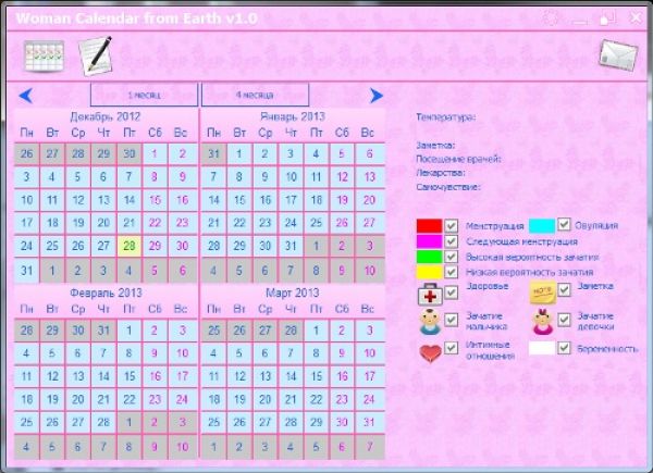 Женский Календарь предназначен для прогнозирования дат с низкой и высокой степенями вероятности наступления беременности, дней начала месячных, дат зачатий и прогнозируемого пола будущего ребенка. Результаты прогноза могут использоваться для планирования зачатия ребенка или, наоборот, для предотвращения наступления нежелательной беременности. В календаре можно указать начало беременности, и программа построит прогноз на все возможные 42 недели беременности с описанием по неделям.