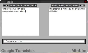Маленькая программа, с помощью которой можно переводить различные фразы и предложения на другие языки, все просто вводите текст в первое поле, нажимаете перевести и получаете переведенный текст во втором поле, языки выбираются над полями. Перевод происходит с помощью Google переводчика, и теперь не обязательно заходить на сайт чтобы перевести текст достаточно воспользоваться этой программой.