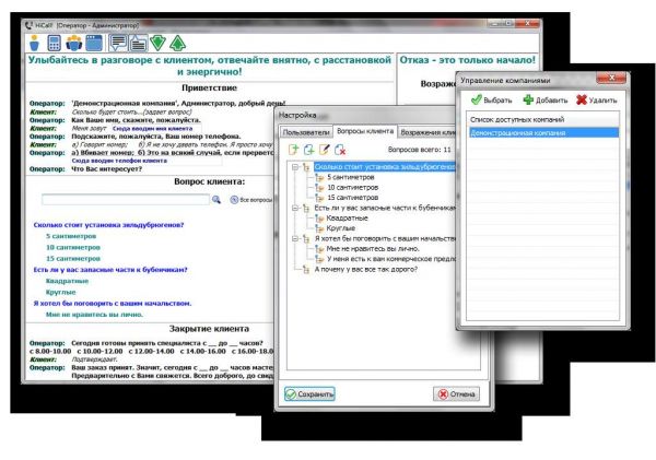 Программа проста в использовании и не требует каких-то особых умений и навыков. Она позволяет работать одновременно со множеством компаний, легко переключаясь между ними. Для каждой компании создается своя новая база с предустановленным пользователем (Администратор). Администратору доступны "Настройки" программы, где он может добавлять операторов, добавлять, удалять и редактировать вопросы-ответы и возражения клиентов.