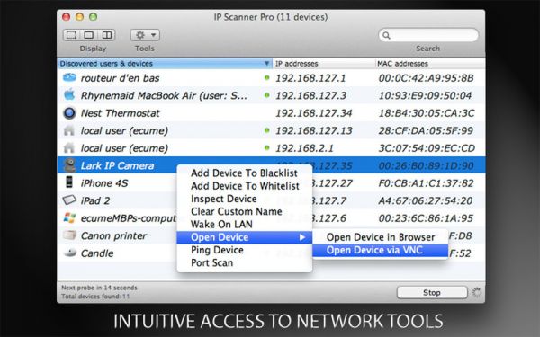 IP Scanner для Macintosh сканирует локальную сеть для установления адресов всех машин и интернет-устройств в локальной сети. Мощные результаты при высокой доступности программы делают ее отличным выбором для пользователей любого уровня.