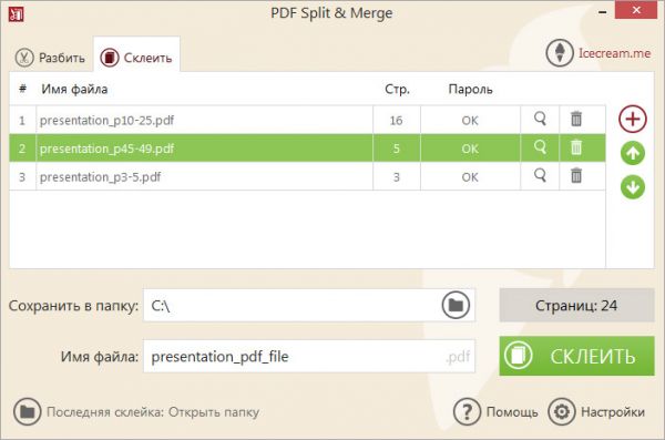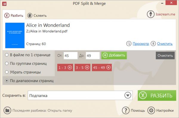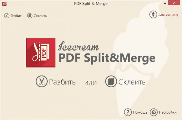 IceCream PDF Split&Merge это простая в использовании, но мощная программа для разбиения и слияния PDF файлов. Программой предлагаются 4 различные вида разбиения документов: удаление страниц, разбиение документов на одностраничные файлы, разбиение на интервалы страниц и по группам страниц. Утилита позволяет как разбивать запароленные файлы, так и использовать их при слиянии нескольких файлов в один (для успешной работы необходимо ввести верный пароль). Механизм drag&drop позволяет легко корректировать позицию файлов в очереди на слияние, а функция предпросмотра файла на разбиение поможет разбить файл в соответствии с требованиями.