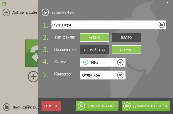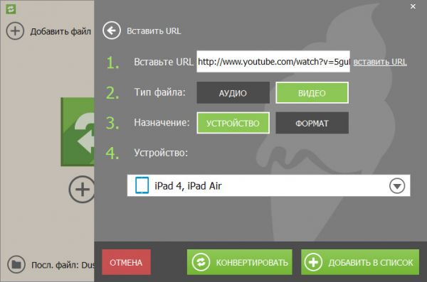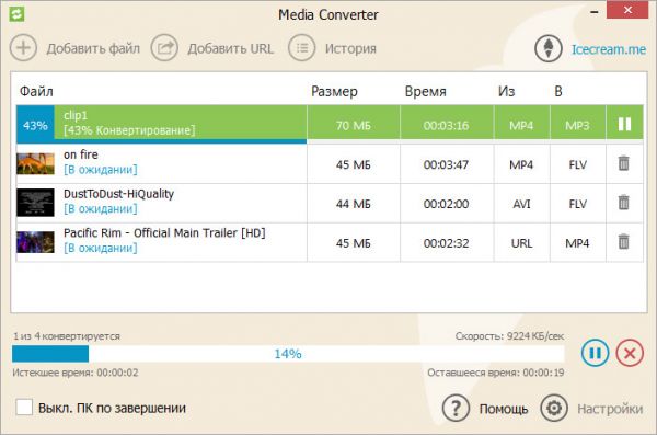 IceCream Media Converter - многофункциональный медиа конвертер для работы как с аудио и видео файлами, так и для скачивания и конвертирования видео с YouTube. Программа также позволяет конвертировать файлы конкретно для определенных устройств, например для iPhone, iPad, Android, смартфонов Samsung, Nokia и BlackBerry, а также для смарфтонов на платформе Android, Xbox, PSP и других.