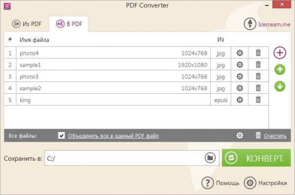 Icecream PDF Converter – мощная и простая в использовании программа для конвертирования файлов из и в PDF. Файлы таких форматов, как DOC, DOCX, XLS, ODT, ODS, HTML, HTM, EPUB, MOBI, FB2, JPEG, JPG могут сконвертированы в PDF, PDF же можно превратить в JPG, PNG, BMP и другие форматы.