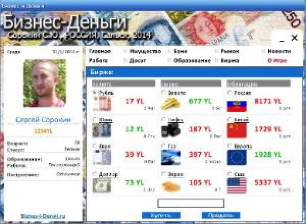 Новая интерпретация старой и давно забытой игры. В этой игре, экономическом симуляторе бизнесмена, задача разбогатеть за счет сделок с валютами и сырьем. Все как в реальной жизни, довольная жена от новых покупок, покупки детям, штрафы и пени от налоговой, кредиты, вклады, дома, машины, казино… Игра заставит Вас испытать положительные эмоции!