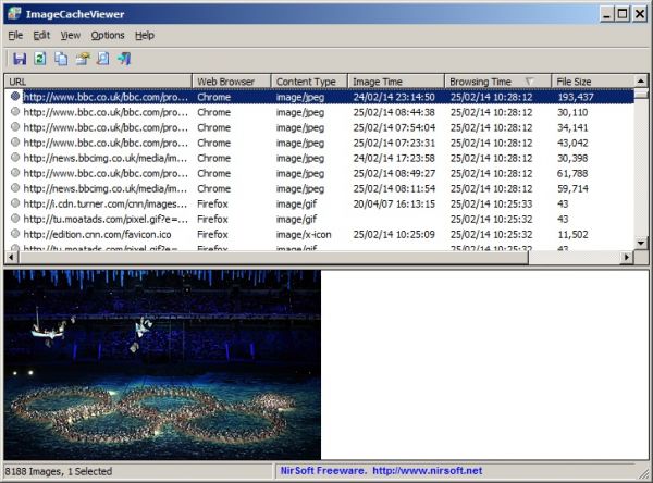 Утилита ImageCacheViewer сканирует кэш ваших браузеров и выявляет информацию, относительно просмотренных картинок. Каждый закэшированный объект, содержит следующую информацию: тип изображения, когда его открыли, url изображения, время и дата изображения, размер файла. В верхней панели, где показывается список всех закэшированных объектов, вы можете выбрать картинку и скопировать её в буфер обмена.