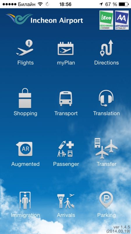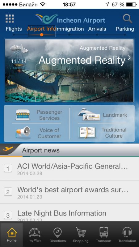 Официальное мобильное приложение международного аэропорта Инчхон, Южная Корея. Один из крупнейших аэропортов мира.