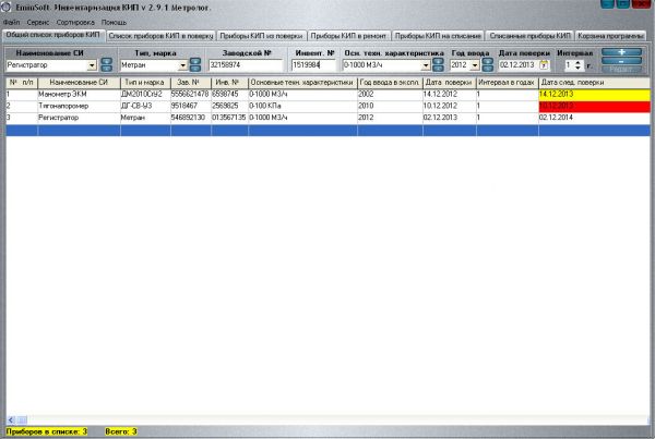 Ведет контроль сроков поверки и подскажет метрологу о приближении конца срока действия поверки и о его полном завершении, выделяя такие приборы в списках желтым или красным цветом. Позволяет отсортировать