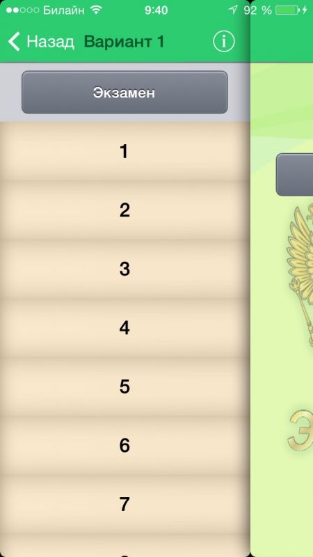 Реализовано два режима работы. Первый - тренировка, необходимо отвечать на вопросы и тут же смотреть результаты ответов. ВТорой режим - Экзамен. В этом режиме необходимо на время ответить на все вопросы и узнать свой результат в конце.