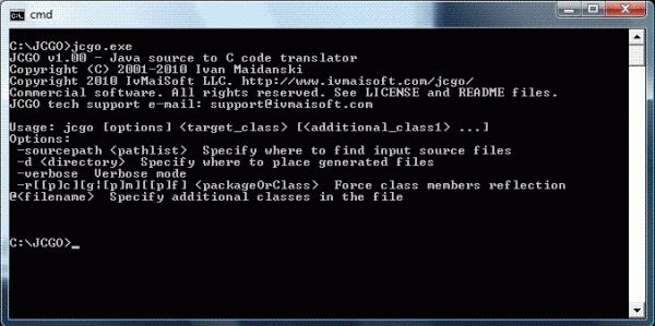С помощью JCGO, можно переконвертировать программу, сделанную на Java в независимый Си код, для последующей его компиляции. Благодаря этой утилите, все мобильные и встроенные Java приложения можно использовать наиболее полно. И более того, JCGO защитить ваше приложение при компиляции и сделает его невозможным для чтения и редактирования.