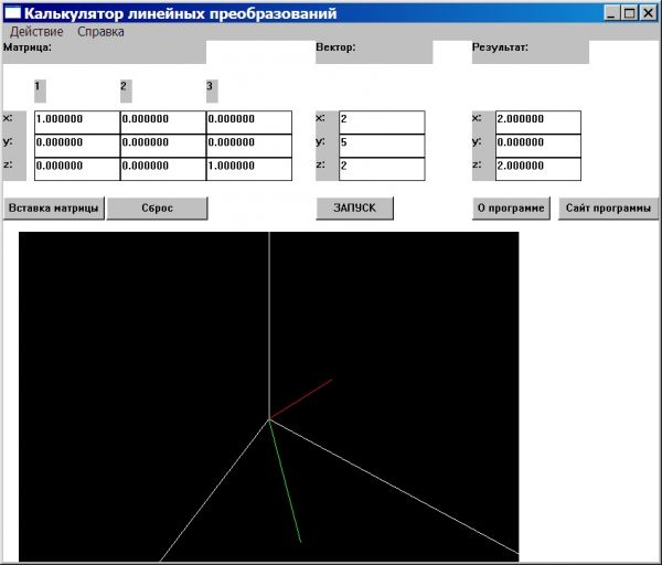 Калькулятор линейных преобразований - это графическая оболочка, которая позволяет в трехмерном виде предоставить линейные преобразования векторов. В основе утилиты используется библиотека OpenGL.