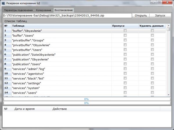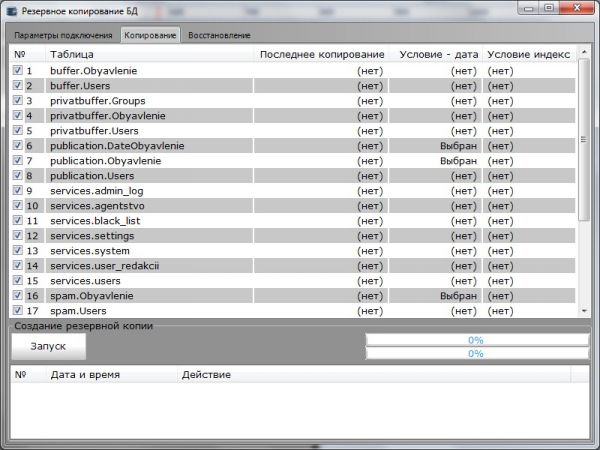 Небольшая утилита для резервного копирования баз данных, пока что поддерживает только PostgreSQL. Из особенностей для копирования и восстановления не требуются права root, которые провайдеры часто не предоставляют. Программа позволяет настроить, какие именно таблицы из базы копировать. Можно настроить условия по индексу (например, от минимального до максимального - 1000), и полю с датой (выбрать диапазон значений за последний месяц). В случае если в базе много обязательных связей, то открытый бекап придется восстанавливать по таблично, а также хранить структуру БД. Программу можно назначить в «Задания» ОС с параметром –autobackup назначив периодичность запуска, и резервные копии будут делаться автоматически в трее.