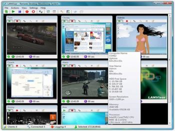 Программа предназначена для использования в локальной компьютерной сети и служит для наблюдения, и записи действий пользователей. Система LANVisor совместима с такими программами удаленного администрирования как RAdmin, Ultr@VNC, RealVNC, TightVNC, что дает возможность управлять мышью и клавиатурой компьютера подключенного к сети. На предприятии применение системы поможет начальнику уличить подозреваемых сотрудников в нарушении распорядка рабочего дня или дисциплины на рабочем месте, и тем самым увеличить производительность труда. В компьютерном классе система даст возможность учителю наблюдать за ходом и степенью выполнения задач учениками. Поможет увидеть, чем занимались ученики на компьютерах, за время отсутствия учителя в классе. В Интернет-кафе или игровом компьютерном зале, система поможет администратору оценить общую картину того, чем заняты пользователи, и в случае необходимости, помочь им, не покидая своего рабочего места. Позволит просмотреть информацию о некоторых системных ресурсах удаленных компьютеров. Основные возможности серверной программы: - упорядоченное представление скриншотов удаленных компьютеров; - гибкая настройка размеров и очередности расположения представляемых скриншотов; - автоматическая, упорядоченная, запись скриншотов на жесткий диск; - совместимость с утилитами удаленного администрирования, позволяющими управлять мышью и клавиатурой на удаленном компьютере; - полноразмерное представление скриншотов в отдельном окне с дополнительными функциями; - просмотр скриншотов в виде слайдшоу; - отправка текстовых сообщений; - управление работой сразу всех, или отдельно взятых клиентов; - отображение информации о размере свободного места на жестком диске удаленного компьютера, а также другой информации о системных ресурсах; - управление электропитанием и уровнем общей громкости аудиоустройства на удаленном компьютере; - ограничение доступа к программе паролем; - удаленное управление настройками клиентской программы.