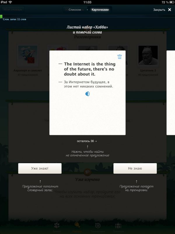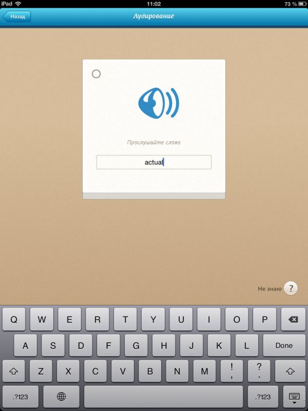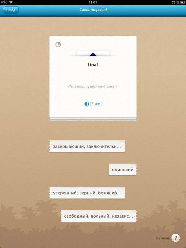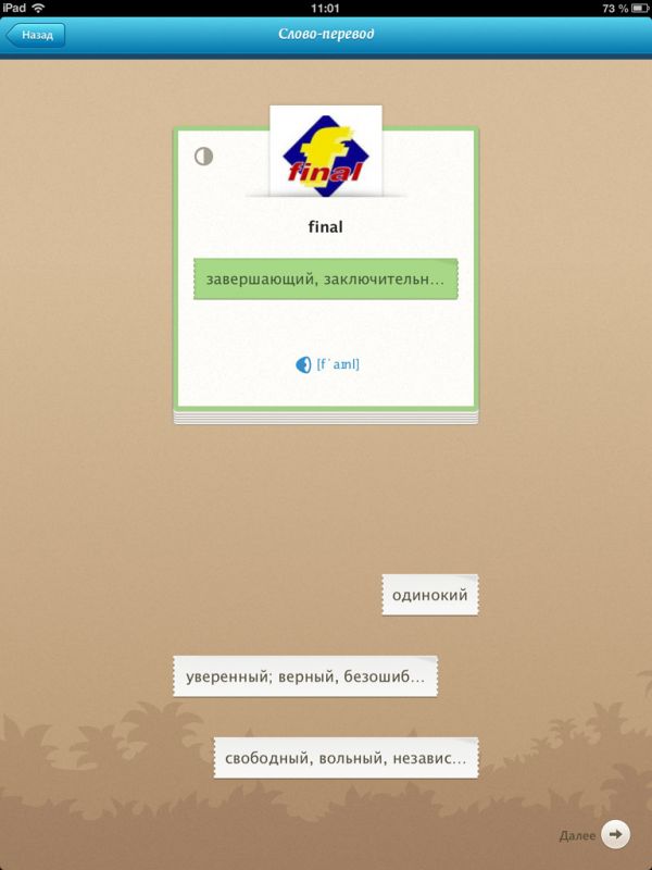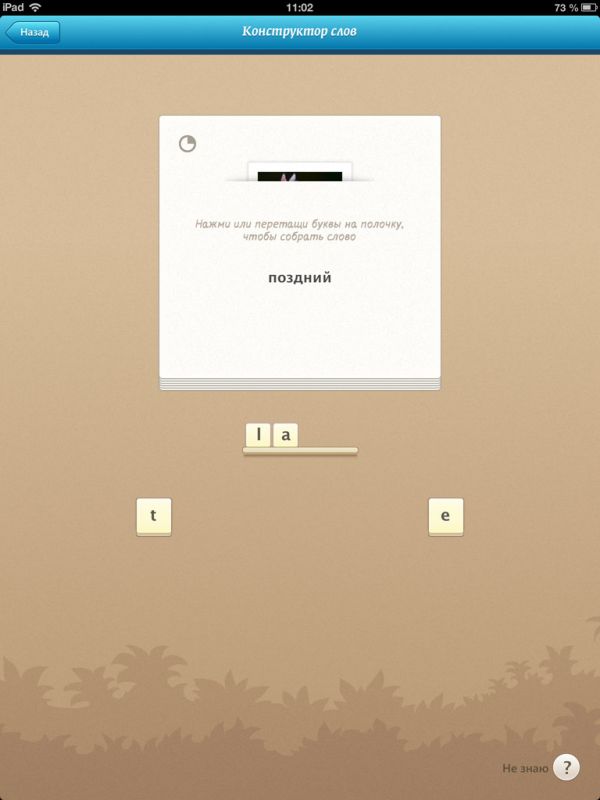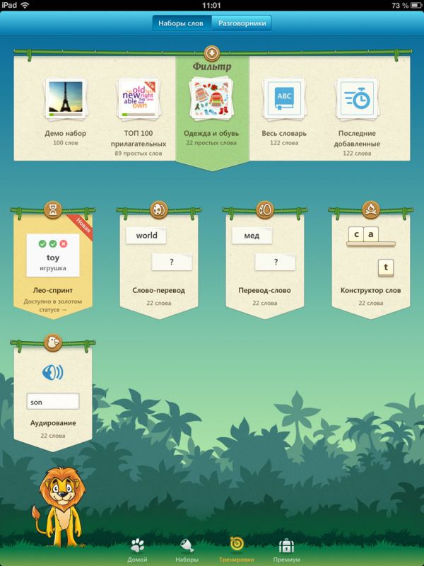 - Тренировки в виде перевода слов, создания слов из букв, написание слова по звуку.