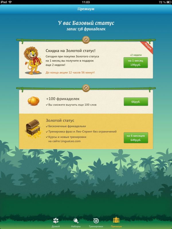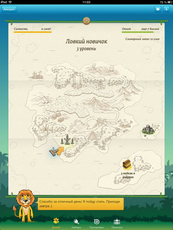 LinguaLeo - известный сервис по изучению английского языка с недавнего времени доступен в качестве приложения для айфона и айпада. Отличный дизайн. Процесс выучивания новых слов представлен в качестве интересной интерактивной игры. Главный персонаж игры - лев Лео, которого периодически нужно подкармливать изучением новых слов.