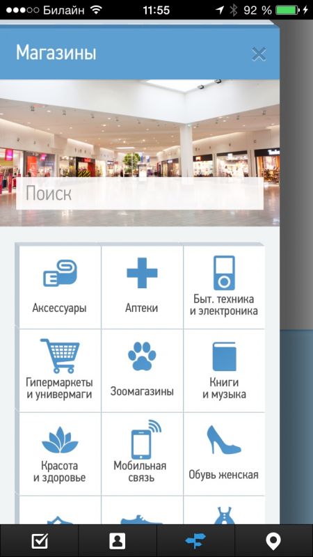 - Список магазинов, которые сгруппирированы по различным категориям (одежда, обувь, спорт и т.д.).