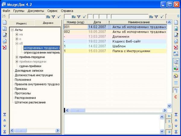 Каждая база данных в программе МодусДок состоит из таблицы групп и таблицы записей. Группы представлены на двух вкладках Индекс и Дерево, причём Дерево генерируется автоматически!