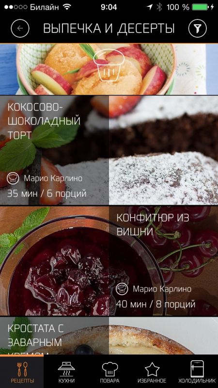 Кулинарные рецепты распределены по нескольким категориям. Во-первых, по типу: завтраки, напитки, выпечка и десерты и т.д. Во-вторых по кухням: украинская, аргентинская, русская, французская и т.д. В третьих по шеф-поварам - Морда Рафауи, Лоренцо Страппато, Евгений Катайкин и др.